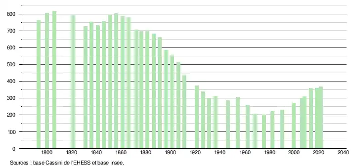 L'évolution du nombre d'habitants est connue à travers les recensements de la population effectués dans la commune depuis 1793. Pour les communes de moins de 10 000 habitants, une enquête de recensement portant sur toute la population est réalisée tous les cinq ans, les populations légales des années intermédiaires étant quant à elles estimées par interpolation ou extrapolation[31]. Pour la commune, le premier recensement exhaustif entrant dans le cadre du nouveau dispositif a été réalisé en 2008[32].