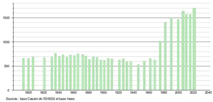 L'évolution du nombre d'habitants est connue à travers les recensements de la population effectués dans la commune depuis 1793. Pour les communes de moins de 10 000 habitants, une enquête de recensement portant sur toute la population est réalisée tous les cinq ans, les populations légales des années intermédiaires étant quant à elles estimées par interpolation ou extrapolation[21]. Pour la commune, le premier recensement exhaustif entrant dans le cadre du nouveau dispositif a été réalisé en 2005[22].