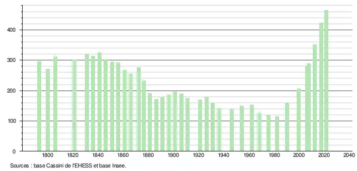 L'évolution du nombre d'habitants est connue à travers les recensements de la population effectués dans la commune depuis 1793. Pour les communes de moins de 10 000 habitants, une enquête de recensement portant sur toute la population est réalisée tous les cinq ans, les populations légales des années intermédiaires étant quant à elles estimées par interpolation ou extrapolation[20]. Pour la commune, le premier recensement exhaustif entrant dans le cadre du nouveau dispositif a été réalisé en 2007[21].