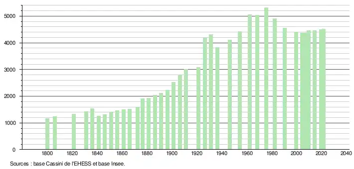 L'évolution du nombre d'habitants est connue à travers les recensements de la population effectués dans la commune depuis 1800. Pour les communes de moins de 10 000 habitants, une enquête de recensement portant sur toute la population est réalisée tous les cinq ans, les populations légales des années intermédiaires étant quant à elles estimées par interpolation ou extrapolation[21]. Pour la commune, le premier recensement exhaustif entrant dans le cadre du nouveau dispositif a été réalisé en 2004[22].