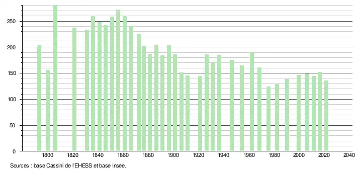 L'évolution du nombre d'habitants est connue à travers les recensements de la population effectués dans la commune depuis 1793. Pour les communes de moins de 10 000 habitants, une enquête de recensement portant sur toute la population est réalisée tous les cinq ans, les populations légales des années intermédiaires étant quant à elles estimées par interpolation ou extrapolation[19]. Pour la commune, le premier recensement exhaustif entrant dans le cadre du nouveau dispositif a été réalisé en 2006[20].