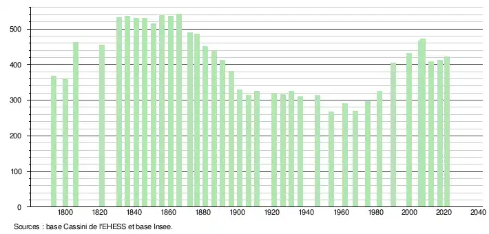 L'évolution du nombre d'habitants est connue à travers les recensements de la population effectués dans la commune depuis 1793. Pour les communes de moins de 10 000 habitants, une enquête de recensement portant sur toute la population est réalisée tous les cinq ans, les populations légales des années intermédiaires étant quant à elles estimées par interpolation ou extrapolation[28]. Pour la commune, le premier recensement exhaustif entrant dans le cadre du nouveau dispositif a été réalisé en 2007[29].