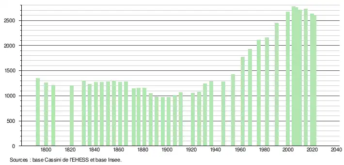 L'évolution du nombre d'habitants est connue à travers les recensements de la population effectués dans la commune depuis 1793. Pour les communes de moins de 10 000 habitants, une enquête de recensement portant sur toute la population est réalisée tous les cinq ans, les populations légales des années intermédiaires étant quant à elles estimées par interpolation ou extrapolation[35]. Pour la commune, le premier recensement exhaustif entrant dans le cadre du nouveau dispositif a été réalisé en 2004[36].