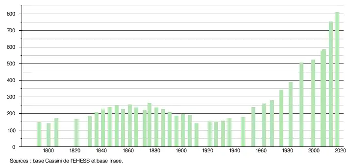 L'évolution du nombre d'habitants est connue à travers les recensements de la population effectués dans la commune depuis 1793. Pour les communes de moins de 10 000 habitants, une enquête de recensement portant sur toute la population est réalisée tous les cinq ans, les populations légales des années intermédiaires étant quant à elles estimées par interpolation ou extrapolation[2]. Pour la commune, le premier recensement exhaustif entrant dans le cadre du nouveau dispositif a été réalisé en 2007[3].