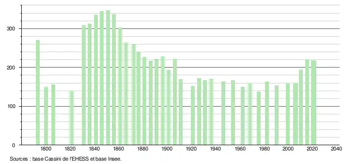L'évolution du nombre d'habitants est connue à travers les recensements de la population effectués dans la commune depuis 1793. Pour les communes de moins de 10 000 habitants, une enquête de recensement portant sur toute la population est réalisée tous les cinq ans, les populations légales des années intermédiaires étant quant à elles estimées par interpolation ou extrapolation[18]. Pour la commune, le premier recensement exhaustif entrant dans le cadre du nouveau dispositif a été réalisé en 2005[19].
