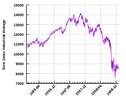 Niveau moyen du Dow Jones Industrial, entre janvier 2006 et novembre 2008[14].