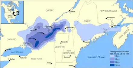 Le verglas massif[6] de janvier 1998 dans le Nord-Est de l'Amérique du Nord est une période de cinq jours consécutifs en où une série de perturbations météorologiques donnèrent de la pluie verglaçante dans l'Est du Canada, la Nouvelle-Angleterre et le nord de l'État de New York. Le verglas, atteignant plus de dix centimètres d'épaisseur par endroits, a provoqué l'un des plus importants désastres naturels en Amérique du Nord. Il est possible également de parler de tempête de pluie verglaçante mais ce terme est généralement réservé dans un cas où les précipitations sont accompagnées de vents violents, ce qui n'est pas le cas ici[7],[8].