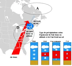 Les précipitations qui se forment dans l'air doux d'altitude se transforment en pluie en dessous du niveau où la température dépasse le point de congélation mais cette pluie se recongèle au contact du sol sous zéro. Si la couche froide est trop épaisse, les gouttelettes se transforment en granule de glace avant de tomber au sol et il s'agit alors de grésil moins dommageable[9].