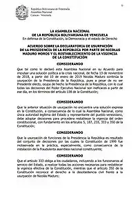 Après le discours de Guaidó, l'Assemblée nationale a publié un premier communiqué de presse selon lequel il était désormais président par intérim. Un second communiqué remplaça le premier et clarifia la position de Guaidó, réaffirmant sa volonté de devenir président par intérim, mais précisant que le pouvoir devait encore être pris[36]. Cette motion n'était pas considérée par eux comme un coup d'État, compte tenu de l'« illégitimité » reconnue de Maduro par plusieurs gouvernements étrangers, et des processus constitutionnels que l'Assemblée nationale suivait[37], en particulier les articles 233, 333, et 350 de la Constitution vénézuélienne qu'ils invoquent[24]. Le jour-même, Guaidó a reçu une lettre du président du Tribunal suprême de justice vénézuélien en exil, basé au Panama, lui demandant de devenir président par intérim du Venezuela[38].