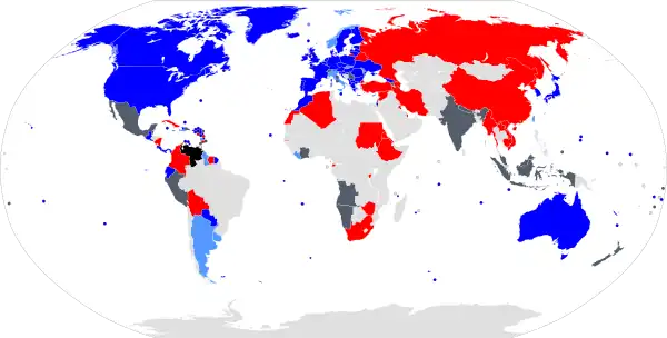 Le , après une grande marche de l'opposition, Juan Guaidó s'autoproclame « président en exercice » du Venezuela et prête serment au cours d'une manifestation organisée à Caracas[58]. Il obtient immédiatement la reconnaissance des États-Unis, du Canada, du Brésil, de la Colombie et du Pérou[59],[60], tandis que l'Afrique du Sud continue de soutenir le président Maduro[61].