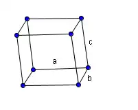 On peut le trouver en réseau primitif (P ) ou en réseau à base rectangulaire centrée (C) (un nœud au milieu de la face définie par les axes a et b). |