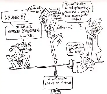 Sébastien Blondeel remarque dans son livre consacré à l'encyclopédie : « Wikipédia présente tous les points de vue pertinents sur un sujet, sans en favoriser aucun, sans opter pour un compromis, sans verser dans le relativisme ni se soumettre à la dictature de la majorité »[37]. Un autre commentateur écrit au contraire que les personnes contributrices se contrôlant mutuellement, Wikipédia favorise les points de vue dominants ou promus par des minorités actives, ce qui a pour effet l'absence de points de vue critiques dans des articles sur la religion[38].