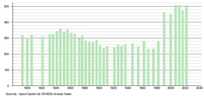 L'évolution du nombre d'habitants est connue à travers les recensements de la population effectués dans la commune depuis 1793. Pour les communes de moins de 10 000 habitants, une enquête de recensement portant sur toute la population est réalisée tous les cinq ans, les populations légales des années intermédiaires étant quant à elles estimées par interpolation ou extrapolation[29]. Pour la commune, le premier recensement exhaustif entrant dans le cadre du nouveau dispositif a été réalisé en 2006[30].