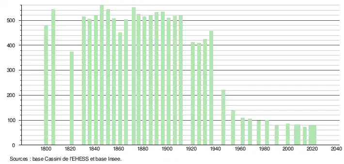 L'évolution du nombre d'habitants est connue à travers les recensements de la population effectués dans la commune depuis 1800. Pour les communes de moins de 10 000 habitants, une enquête de recensement portant sur toute la population est réalisée tous les cinq ans, les populations légales des années intermédiaires étant quant à elles estimées par interpolation ou extrapolation[13]. Pour la commune, le premier recensement exhaustif entrant dans le cadre du nouveau dispositif a été réalisé en 2008[14].