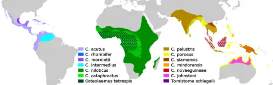 - Osteolaemus tetraspis Cope, 1861 — Crocodile nain ou Crocodile à front large.