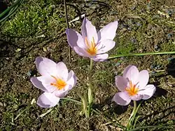 - Crocus longiflorus Raf., le crocus odorant, du sud de l'Italie et de Malte, a des fleurs lilas à gorge orangée et à stigmates rouges.