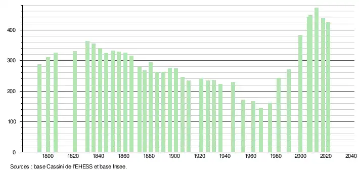 L'évolution du nombre d'habitants est connue à travers les recensements de la population effectués dans la commune depuis 1793. Pour les communes de moins de 10 000 habitants, une enquête de recensement portant sur toute la population est réalisée tous les cinq ans, les populations légales des années intermédiaires étant quant à elles estimées par interpolation ou extrapolation[21]. Pour la commune, le premier recensement exhaustif entrant dans le cadre du nouveau dispositif a été réalisé en 2007[22].