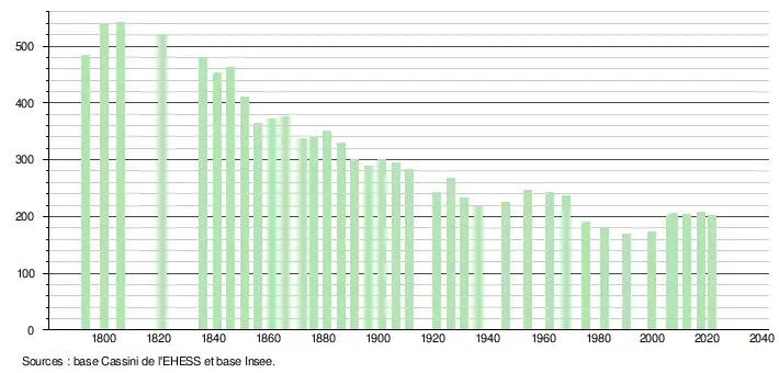 L'évolution du nombre d'habitants est connue à travers les recensements de la population effectués dans la commune depuis 1793. Pour les communes de moins de 10 000 habitants, une enquête de recensement portant sur toute la population est réalisée tous les cinq ans, les populations légales des années intermédiaires étant quant à elles estimées par interpolation ou extrapolation[19]. Pour la commune, le premier recensement exhaustif entrant dans le cadre du nouveau dispositif a été réalisé en 2007[20].