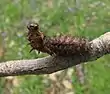 La chenille, épineuse, est marron foncée ornée d'une bande jaune sur chaque flanc[2].