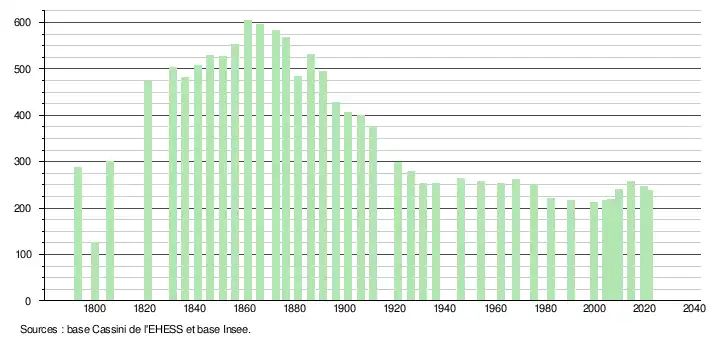 L'évolution du nombre d'habitants est connue à travers les recensements de la population effectués dans la commune depuis 1793. Pour les communes de moins de 10 000 habitants, une enquête de recensement portant sur toute la population est réalisée tous les cinq ans, les populations légales des années intermédiaires étant quant à elles estimées par interpolation ou extrapolation[15]. Pour la commune, le premier recensement exhaustif entrant dans le cadre du nouveau dispositif a été réalisé en 2004[16].