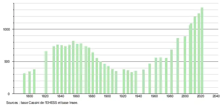 L'évolution du nombre d'habitants est connue à travers les recensements de la population effectués dans la commune depuis 1793. Pour les communes de moins de 10 000 habitants, une enquête de recensement portant sur toute la population est réalisée tous les cinq ans, les populations légales des années intermédiaires étant quant à elles estimées par interpolation ou extrapolation[14]. Pour la commune, le premier recensement exhaustif entrant dans le cadre du nouveau dispositif a été réalisé en 2007[15].