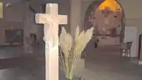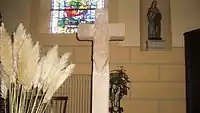 Dans l’enceinte du cimetière, au pied du Kast, se dresse une grande croix en grès rouge qui date de 1838. Au-dessus de l’image du Christ, est sculptée une tête de mort et un serpent qui mord dans la pomme. On distingue les instruments de la passion du Golgotha. Sur le socle on peut voir l’inscription « Non istum Christum sed per istum credo Christum » (Je crois non que ceci soit le Christ mais c’est par celui-ci que je crois que le Christ est).