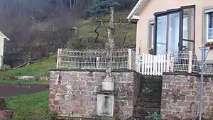 Une autre croix se trouvait sur le chemin à proximité de la cité ouvrière. Cette croix reposait sur un ancien pilier provenant sans doute d’une vieille construction datant de l’époque du prieuré de Lièpvre. Le pilier était monté sur un socle cubique sans décor, portant une traverse et le millésime de 1765. La croix était tournée sur le rain du Calvin, la montée du Ménabois et les autres contreforts du Taennchel[8].
