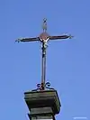 - Une croix simple, nue ou ornementée avec certaines représentations (Vierge à l'Enfant, ostensoir, soleil rayonnant...), ou encore un Christ en croix surmonte le chapiteau ou le tailloir.