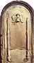 Ce médaillon est relié à la base du chapiteau par un motif traité en bas-relief représentant un entrelacs de cordelettes dont chaque extrémité est terminée par un gland. Sous le médaillon, un cartouche en retrait comprend un bas-relief représentant le triangle divin[11] avec un œil au centre, le tout sur un fond rayonnant.
