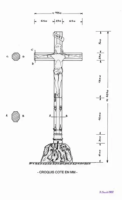 Les termes techniques utilisés pour une description des différents monuments recensés, sont pris dans le Glossaire de termes techniques[6] propres à l’architecture classique. La croix étant une élévation, comme lors de la construction, la description s'effectuera de bas en haut.
