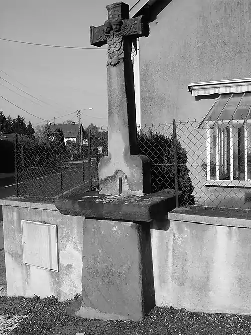 Cette croix est taillée dans un grès jaune, très altéré par le temps. Du calvaire d’origine, qui était constitué d’un appareil classique, seul reste le piédestal au 3/4 enterré, ainsi que le fût. Il serait opportun de dégager le piédestal pour le rendre visible. Un socle existe peut-être. Le piédestal est un parallélépipède simple comportant sur l’avant un cartouche légèrement en retrait, rectangulaire aux quatre angles rentrants en quart de cercle. L’épaisse et très rustique corniche dont il est surmonté, s’élargit par un profil appelée talon. Dans le prolongement vertical du fût, fixé sur l’arrière de la corniche, une croix latine en ciment moulée sans aucune fioriture; le chapiteau a disparu. La base du fût est constituée d’un large bandeau surmonté d’une moulure en tore, puis d’un rétrécissement en doucine sur le fût. Sur l’avant, la partie médiane du fût, comporte un cartouche en relief vers le bas et en retrait vers le haut. Il est de forme rectangulaire prolongé par un demi-cercle centré sur le haut et sur le bas. Il comporte une inscription simple gravée en lettres capitales.