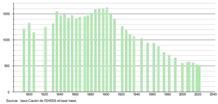 L'évolution du nombre d'habitants est connue à travers les recensements de la population effectués dans la commune depuis 1793. Pour les communes de moins de 10 000 habitants, une enquête de recensement portant sur toute la population est réalisée tous les cinq ans, les populations légales des années intermédiaires étant quant à elles estimées par interpolation ou extrapolation[12]. Pour la commune, le premier recensement exhaustif entrant dans le cadre du nouveau dispositif a été réalisé en 2008[13].