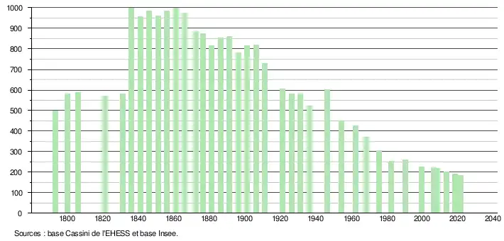 L'évolution du nombre d'habitants est connue à travers les recensements de la population effectués dans la commune depuis 1793. Pour les communes de moins de 10 000 habitants, une enquête de recensement portant sur toute la population est réalisée tous les cinq ans, les populations légales des années intermédiaires étant quant à elles estimées par interpolation ou extrapolation[14]. Pour la commune, le premier recensement exhaustif entrant dans le cadre du nouveau dispositif a été réalisé en 2008[15].