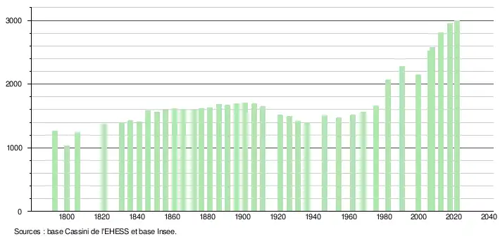 L'évolution du nombre d'habitants est connue à travers les recensements de la population effectués dans la commune depuis 1793. Pour les communes de moins de 10 000 habitants, une enquête de recensement portant sur toute la population est réalisée tous les cinq ans, les populations légales des années intermédiaires étant quant à elles estimées par interpolation ou extrapolation[23]. Pour la commune, le premier recensement exhaustif entrant dans le cadre du nouveau dispositif a été réalisé en 2007[24].