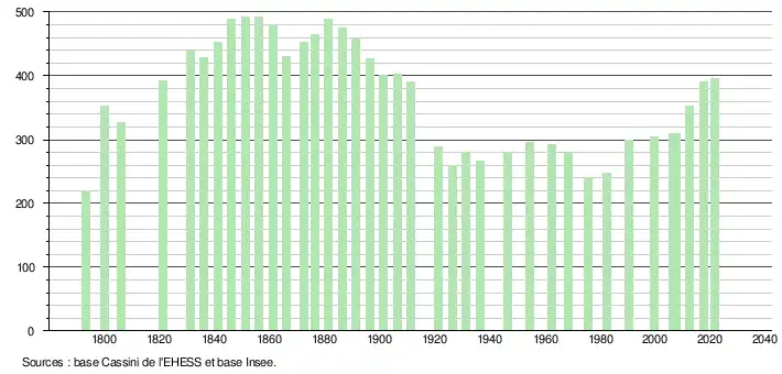 L'évolution du nombre d'habitants est connue à travers les recensements de la population effectués dans la commune depuis 1793. Pour les communes de moins de 10 000 habitants, une enquête de recensement portant sur toute la population est réalisée tous les cinq ans, les populations légales des années intermédiaires étant quant à elles estimées par interpolation ou extrapolation[20]. Pour la commune, le premier recensement exhaustif entrant dans le cadre du nouveau dispositif a été réalisé en 2007[21].