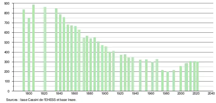 L'évolution du nombre d'habitants est connue à travers les recensements de la population effectués dans la commune depuis 1793. Pour les communes de moins de 10 000 habitants, une enquête de recensement portant sur toute la population est réalisée tous les cinq ans, les populations légales des années intermédiaires étant quant à elles estimées par interpolation ou extrapolation[20]. Pour la commune, le premier recensement exhaustif entrant dans le cadre du nouveau dispositif a été réalisé en 2007[21].