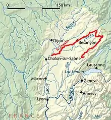 La ville de Besançon s’inscrit dans un important méandre du Doubs de près d’un kilomètre de diamètre parfois comparé à une presqu'île, prenant la forme d’une boucle presque parfaite fermée et surplombée par le mont Saint-Étienne, un haut plateau ouvert sur le Jura[a 1]. Puis la ville a débordé de ce cadre initial pour s’étendre dans une cuvette entourée de sept collines : Chaudanne (422 m), Bregille (458 m), Saint-Étienne (371 m), la Roche d’Or (316 m), Planoise (490 m), Rosemont (466 m), Fort-Benoit (360 m[a 1]). Ce site spécifique a ainsi pendant longtemps été un emplacement idéal de développement urbain, tant d’un point de vue stratégique et militaire (site défensif) qu’économique et commercial (débouché fluvial, forêts, agriculture et élevage[a 1]).