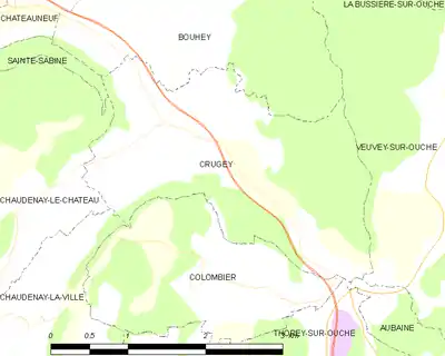 Crugey se situe sur le plateau de l'Arrière côte de Dijon et de Beaune.