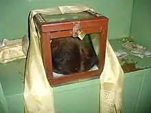 - Sanderson, en comparant la taille de l'animal à la caisse à pétrole standardisée sur laquelle elle repose, déduit qu'il ne s'agit que d'une grande atèle d'un 1,22 m de haut, dont le corps a déjà commencé à se décomposer du fait de l'humidité et de la chaleur (Sanderson 1963, p. 183-85).