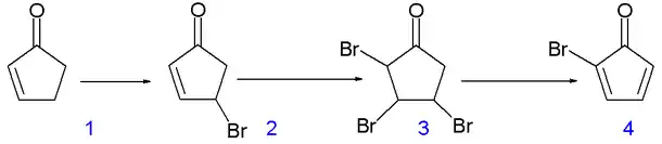 le N-bromosuccinimide (NBS) dans le tétrachlorométhane (CCl4) insère un atome de brome allylique sur 1.1 pour produire le composé 1.2, qui par poursuite de bromation avec du brome dans un mélange pentane/dichlorométhane donne le composé tribromé 1.3. Deux équivalents de bromure d'hydrogène (HBr) sont éliminés de ce composé par la diéthyl amine dans l'éther diéthylique pour former la 2-bromo cyclopentadiènone 1.4.