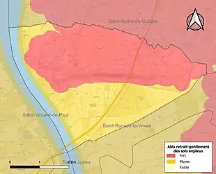Le retrait-gonflement des sols argileux est susceptible d'engendrer des dommages importants aux bâtiments en cas d’alternance de périodes de sécheresse et de pluie. 93,3 % de la superficie communale est en aléa moyen ou fort (67,4 % au niveau départemental et 48,5 % au niveau national). Sur les 1 007 bâtiments dénombrés sur la commune en 2019, 1 007 sont en aléa moyen ou fort, soit 100 %, à comparer aux 84 % au niveau départemental et 54 % au niveau national. Une cartographie de l'exposition du territoire national au retrait gonflement des sols argileux est disponible sur le site du BRGM[33],[Carte 2].