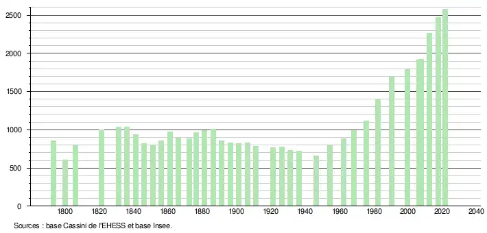 L'évolution du nombre d'habitants est connue à travers les recensements de la population effectués dans la commune depuis 1793. Pour les communes de moins de 10 000 habitants, une enquête de recensement portant sur toute la population est réalisée tous les cinq ans, les populations légales des années intermédiaires étant quant à elles estimées par interpolation ou extrapolation[52]. Pour la commune, le premier recensement exhaustif entrant dans le cadre du nouveau dispositif a été réalisé en 2007[53].