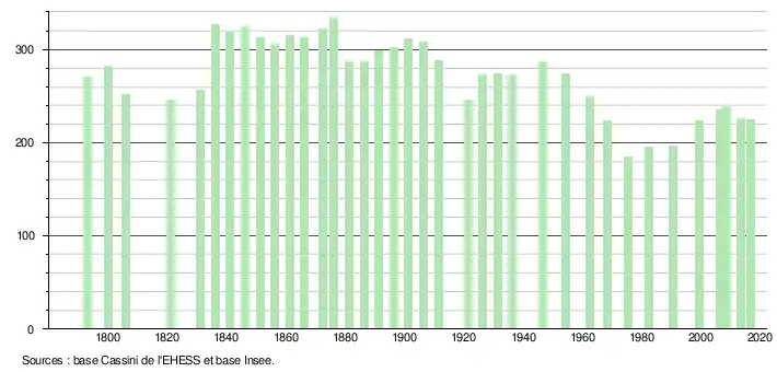L'évolution du nombre d'habitants est connue à travers les recensements de la population effectués dans la commune depuis 1793. Pour les communes de moins de 10 000 habitants, une enquête de recensement portant sur toute la population est réalisée tous les cinq ans, les populations légales des années intermédiaires étant quant à elles estimées par interpolation ou extrapolation[24]. Pour la commune, le premier recensement exhaustif entrant dans le cadre du nouveau dispositif a été réalisé en 2008[25].