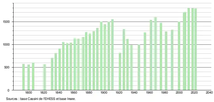 L'évolution du nombre d'habitants est connue à travers les recensements de la population effectués dans la commune depuis 1793. Pour les communes de moins de 10 000 habitants, une enquête de recensement portant sur toute la population est réalisée tous les cinq ans, les populations légales des années intermédiaires étant quant à elles estimées par interpolation ou extrapolation[30]. Pour la commune, le premier recensement exhaustif entrant dans le cadre du nouveau dispositif a été réalisé en 2007[31].