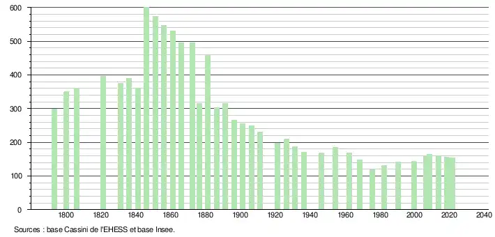 L'évolution du nombre d'habitants est connue à travers les recensements de la population effectués dans la commune depuis 1793. Pour les communes de moins de 10 000 habitants, une enquête de recensement portant sur toute la population est réalisée tous les cinq ans, les populations légales des années intermédiaires étant quant à elles estimées par interpolation ou extrapolation[21]. Pour la commune, le premier recensement exhaustif entrant dans le cadre du nouveau dispositif a été réalisé en 2008[22].