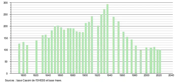 L'évolution du nombre d'habitants est connue à travers les recensements de la population effectués dans la commune depuis 1793. Pour les communes de moins de 10 000 habitants, une enquête de recensement portant sur toute la population est réalisée tous les cinq ans, les populations légales des années intermédiaires étant quant à elles estimées par interpolation ou extrapolation[24]. Pour la commune, le premier recensement exhaustif entrant dans le cadre du nouveau dispositif a été réalisé en 2007[25].