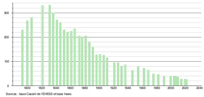 L'évolution du nombre d'habitants est connue à travers les recensements de la population effectués dans la commune depuis 1793. Pour les communes de moins de 10 000 habitants, une enquête de recensement portant sur toute la population est réalisée tous les cinq ans, les populations légales des années intermédiaires étant quant à elles estimées par interpolation ou extrapolation[26]. Pour la commune, le premier recensement exhaustif entrant dans le cadre du nouveau dispositif a été réalisé en 2004[27].