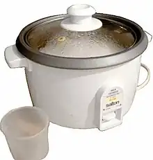 On démarre la cuisson en appuyant sur un bouton qui enclenche (arme) le thermostat principal, l'appareil chauffe à pleine puissance. Le mélange d'eau et de riz ne peut pas dépasser la température d'ébullition de l'eau (toute énergie supplémentaire est investie dans la vaporisation de l'eau). En fin de cuisson, le riz a absorbé l'eau dont il avait besoin. Arrivé à ce point, en l'absence d'eau libre, la température commence à augmenter rapidement au-dessus de 100 °C[1], ce qui est détecté par le thermostat principal qui déclenche et coupe définitivement la cuisson. Ensuite le thermostat secondaire ou le chauffage réduit garde le riz à environ 65 °C jusqu'à consommation. La puissance de chauffe doit être adaptée aux quantités de riz à cuire, c'est-à-dire au volume du récipient: environ 500 W pour un cuiseur dit "1,3 Litre", nettement moins qu'un cuiseur électrique à usage général de capacité comparable où une puissance de 2000 W est fréquemment rencontrée.