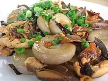 - Pâte de tapioca et d’igname en forme de boulier (算盘子, ) ; peut être cuite avec de l’émincé de poulet, de porc, de crevettes ou de légumes.
