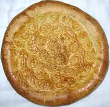 Le pain d'Asie centrale est plat et cuit au tandoor, connu sous le nom de naan ou nan (نان , нан, nan ; 饢, (نْا), il contient du cumin dans sa version ouïghour, consommé avec des graines de sésame, du beurre, du lait, de l'huile végétale, du sel et du sucre . Le Girde (Гирде) est également populaire; c'est un pain de type bagel avec une croûte dure et croustillante. Les Sangza ( ساڭزا , Саңза ;馓子, , صًا ذِ) sont des torsades croustillantes de pâte de farine de blé frite, spécialité des fêtes. Les Samsa ( سامسا , Самса ; كَوْ بَوْ ذِ, littéralement: petits pains cuits au four) sont des tartes à l'agneau cuites au four à l'aide d'un four à briques spécial. Le Yutaza ( يۇتازا , Ютаза ;油塔子, , يِوْتِيَوْ ذِ) est un pain multicouche cuit à la vapeur. Les Göshnan ( گۆشنان , Гөшнан ;饢包肉, , نْا بَوْ ژِوْ) sont des tartes à l'agneau grillées à la poêle. Les Pamirdin sont des tartes cuites au four contenant de l'agneau, des carottes et de l'ognon. La Shorpa est une soupe d'agneau ( شورپا , Шорпа ;羊汤, , يْا تْا).